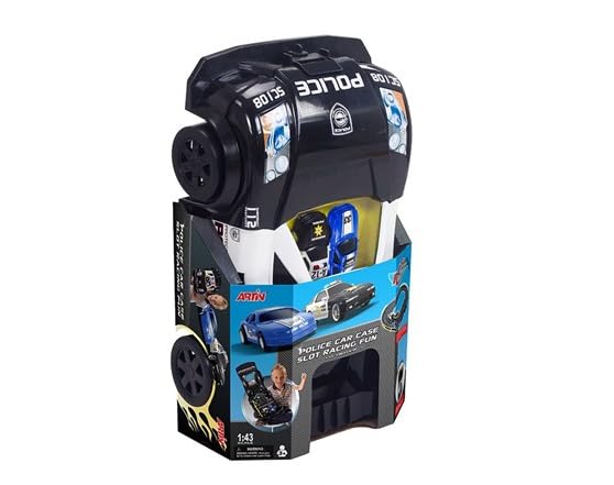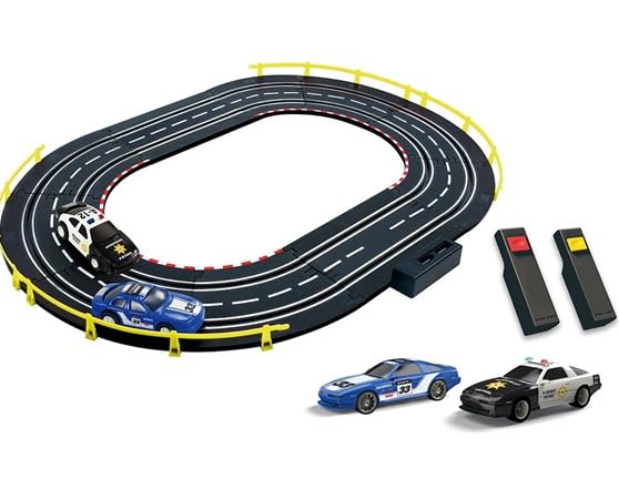 The Police Car Case Slot Racing Fun features a police car design case storing everything of a road racing set within. The race set has a figure 8 design layout. Just open the case, assemble the tracks and have fun with the police car chasing the robber's car! If you're playing as the police car, don't let you friend get away with the robber's car.