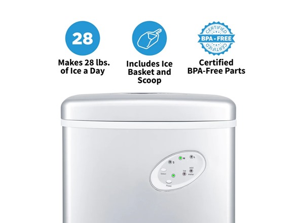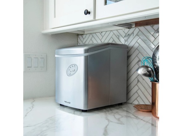 This Newair Countertop Ice Maker keeps you in a steady supply of ice for entertaining at home or everyday use. This compact ice maker looks great in your kitchen, but is also versatile enough to make 3 sizes of ice for any occasion. This NewAir Countertop Ice Maker produces 28 pounds of bullet ice each day and keeps it cold in a well insulated storage compartment. Choose from four stylish colors: black, red, stainless steel or silver.
