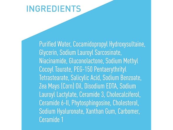 Aqua / Water / Eau, Cocamidopropyl Hydroxysultaine, Glycerin, Sodium Lauroyl Sarcosinate, Niacinamide, Gluconolactone, Peg-150 Pentaerythrityl Tetrastearate, Sodium Methyl Cocoyl Taurate, Zea Mays Oil / Corn Oil, Ceramide Np, Ceramide Ap, Ceramide Eop, Carbomer, Calcium Gluconate, Sodium Chloride, Salicylic Acid, Sodium Benzoate, Sodium Lauroyl Lactylate, Cholecalciferol, Cholesterol, Phenoxyethanol, Disodium Edta, Tetrasodium Edta, Hydrolyzed Hyaluronic Acid, Phytosphingosine, Xanthan Gum, Ethylhexylglycerin