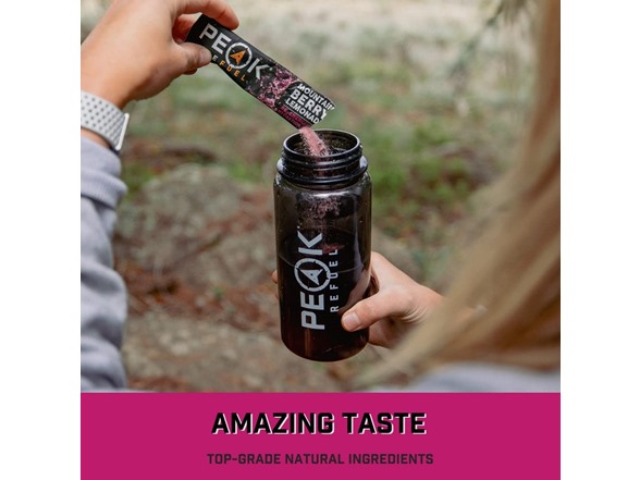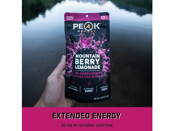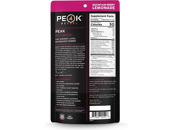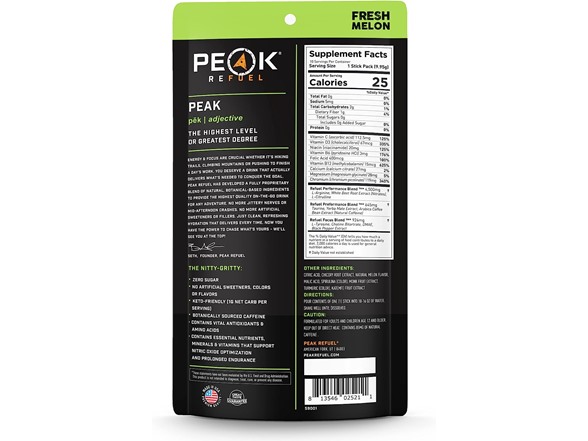 Description: Peak Refuel has developed a fully proprietary blend of natural, botanical-based ingredients to provide the highest quality on-the-go drink for any adventure. We’re keeping you fueled and hydrated for whatever you’re chasing! ZERO SUGAR | NO ARTIFICIAL SWEETENERS, COLORS, FLAVORS, OR PRESERVATIVES | KETO-FRIENDLY | 85mg NATURAL CAFFEINE PER STICK