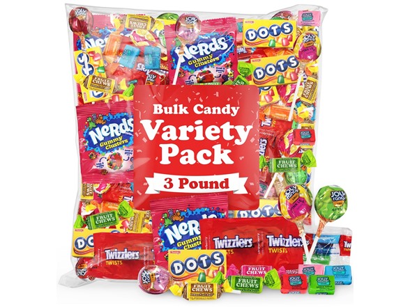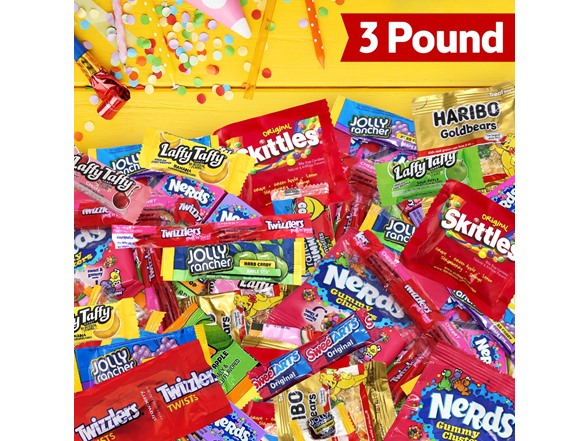 3-Pound Candy Assortment – Packed with a delicious mix of individually wrapped candies, this bulk variety pack offers a perfect selection for piñata fillers, party treats, and snack lovers of all ages. Enjoy a combination of fruity, chewy, sour, and chocolatey flavors that satisfy every craving.