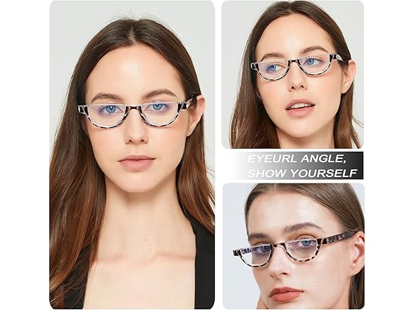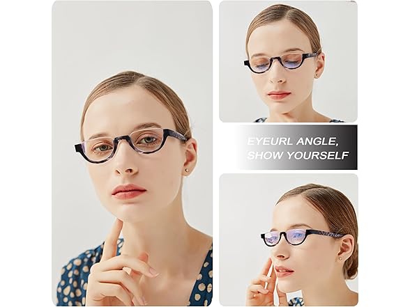 - 👓【Fashion Half Frame Reading Glasses】The slim frame and rimless silhouette provide a classic look that never goes out of style. The half-moon shape lens allow you simply look down to read when you need and look up your surroundings without continuously taking them on and off.