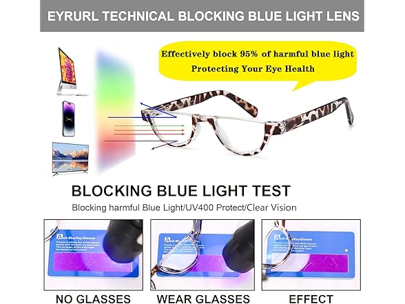 - 👓【Blue Light Blocking Reading Glasses】EYEURL Blue light blocker with UV400 protection, Blue light blocking lens, anti glare and cut more than 95% of harmful blue light. Reduces eye strain and discomfort caused from long periods of reading, using personal computer/ TV/ phones/laptop and work under fluorescent lights.