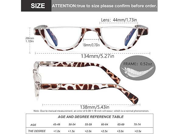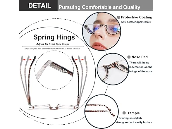 - 👓【Reading Glasses With Adjustable Spring Hinge】Half Frame Reading Glasses is suitable for round face,oval face,square face and other face shapes.Classic design with adjustable spring hinge let the glasses temples can open up to 25°outwards ,close more smoothly.You can protect your eyes while looking stylish.