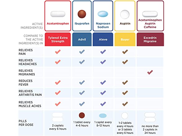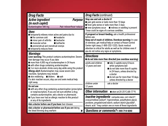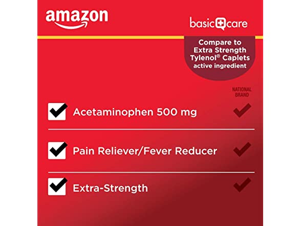 Amazon Basic Care Extra Strength Pain Relief, Acetaminophen Caplets, 500 mg, temporarily relieves minor aches and pains due to the common cold, headache, backache, minor pain of arthritis, toothache, muscular aches, premenstrual and menstrual cramps. Also temporarily reduces fever. May be used as a pain reliever and fever reducer for adults and children 12 years and over. Compare to Extra Strength Tylenol Caplets active ingredient.