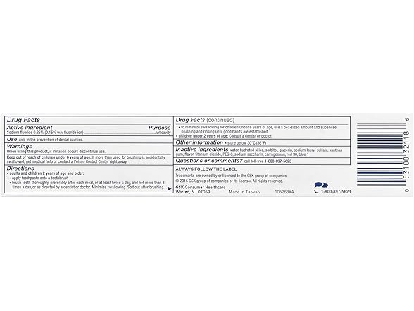 Sodium fluoride 0.25% (0.15% w/v fluoride ion), water, hydrated silica, sorbitol, glycerin, sodium lauryl sulfate, xanthan gum, flavor, titanium dioxide, PEG-8, sodium saccharin, carrageenan, red 30, blue 1
