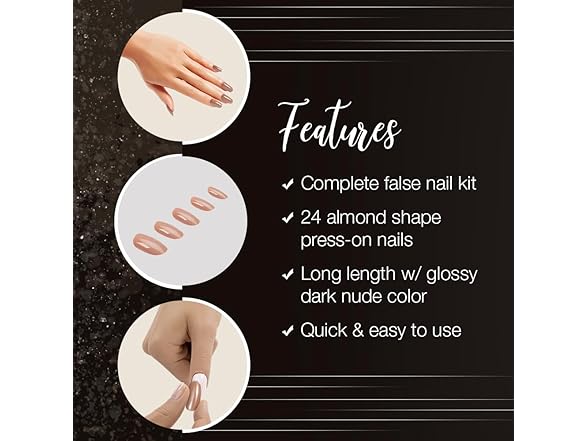 - Exquisite, Dark Nude Nails: High-quality artificial nails set crafted with long length and almond shape tips; glossy with an extra dark hue just as like your favorite café au lait; an upgraded look of traditional yet stunning nails; perfect for clean and minimalist vibe; classic and complements any outfit you choose; each pack contains everything you need from prepping to designing your nails; includes 24 long-length nails, professional glue, a mini file, and a cuticle stick; sturdy on the nails and completely reusable; safe and gentle on your natural nails; beginner and pro-nails friendly