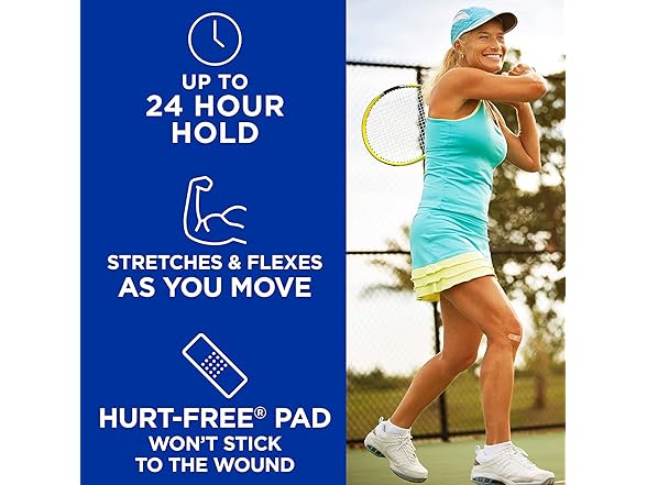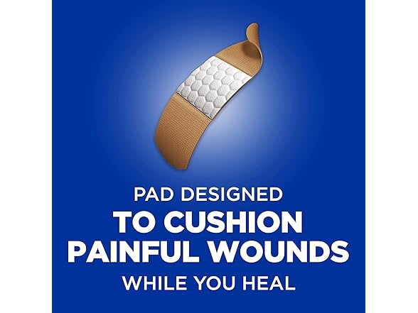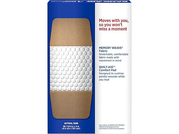 BAND-AID Brand Flexible Fabric Non-Stick Sterile Adhesive Bandages, offer comfortable protection for minor wounds. Made with MEMORY WEAVE fabric for ultimate flexibility, these BAND-AID Brand Flexible Fabric Bandages stretch as you move. Each sterile bandage features a QUILT-AID Comfort Pad designed to cushion painful wounds while you heal. Made with a non-stick HURT-FREE Pad, these comfortable flexible bandages won’t stick to the wound, allowing for gentle removal.