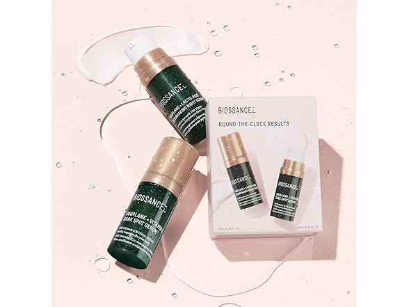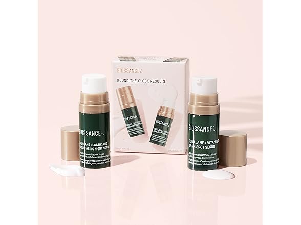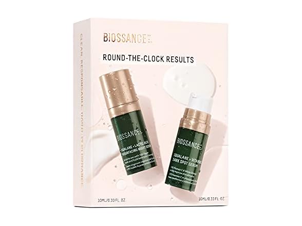 (1) Biossance Round the Clock Results Set. Travel Size Set of 1 Squalane + Lactic Acid Night Serum (0.3 oz) Bundle with 1 Squalane + Vitamin C Dark Spot Serum (0.3 oz) for Clear, Glowing Skin