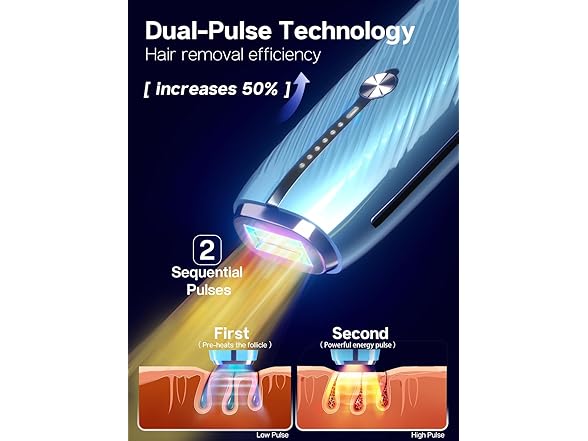 - 【Dual-Pulse Technology】The first to transition clinical-grade technique to home IPL hair removal devices. This innovative approach emits two sequential pulses: the first gently pre-heats the follicle, followed by a second, more targeted pulse. This technique enhances hair removal efficiency by 50%, offering a safer, more effective permanent at-home solution