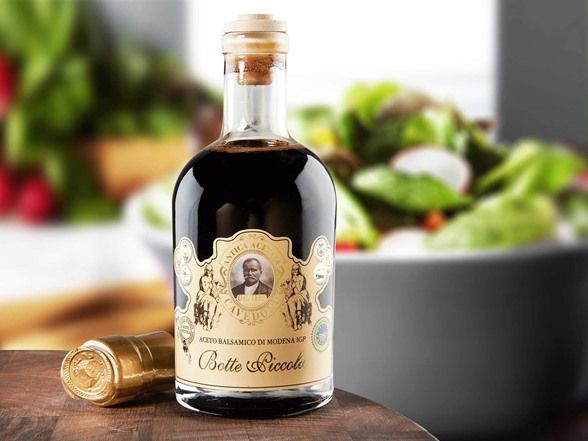 - Description: The Cavedoni Botte Piccola is an authentic Aceto Balsamico di Modena that is aged seven years. It comes with a dosage cap for finishing risotto, meats, cheese and other fine Italian foods. It has a nice natural viscosity with a good balance between sweetness and acidity.