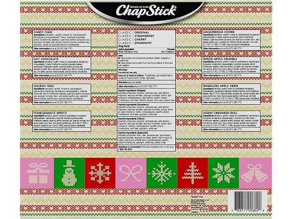 - 12 DAYS OF FESTIVE LIP CARE: You can’t go wrong with paraben-free and cruelty-free ChapSticks. Enjoy 12 days and 12 holiday-inspired flavored lip balms that soften and smooth dry lips with time-tested ingredients.