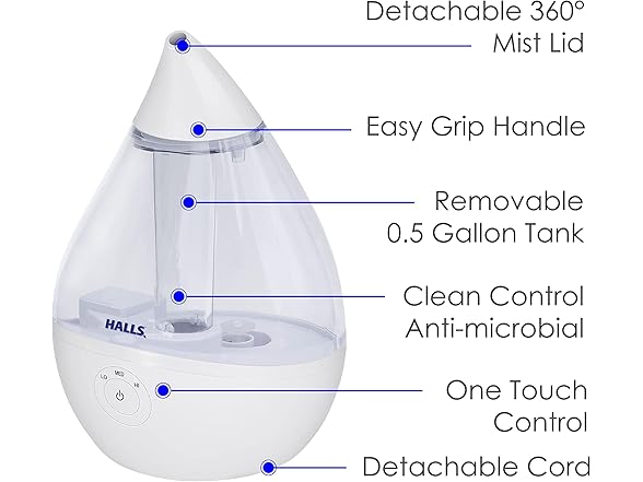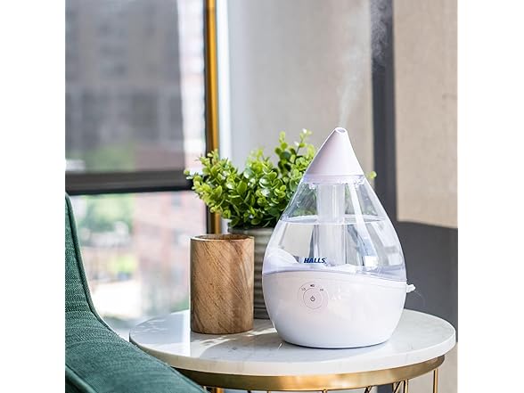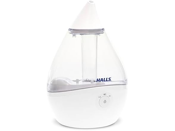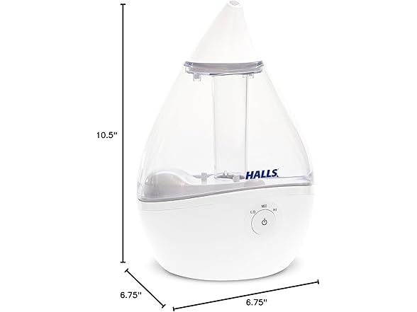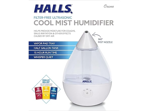 The Crane x HALLS Droplet Cool Mist Humidifier provides up to 250 sq. ft. of coverage and up to 15-hours of soothing moisture to help alleviate cold & flu symptoms and get relief from the effects of dry air. Try with HALLS Scented Vapor Pads for an additional soothing experience.