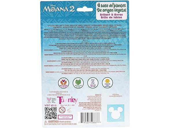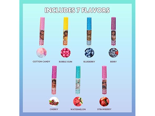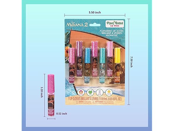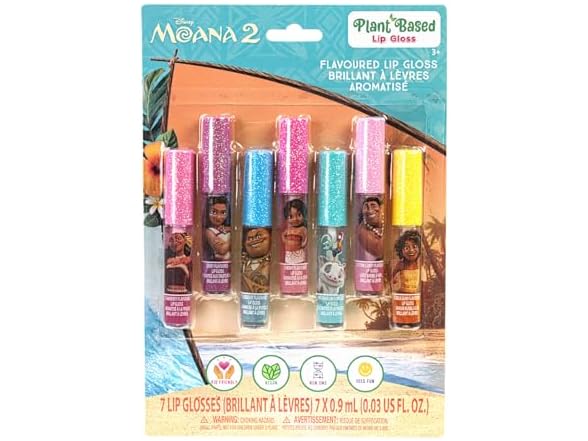 - This Moana 2 lip gloss set is perfect for the little voyager in your life, who just wants a bit of sparkle and adventure. With 7 different flavors to choose from your child will never get bored. What girl doesn’t love lip gloss that comes in all sorts of pretty and fun colors and scents? Not only do our lip glosses look and smell deliciously magical, but they’re made with naturally derived ingredients, so Mom definitely will love these as much as her little one does!