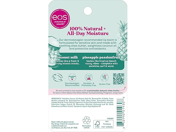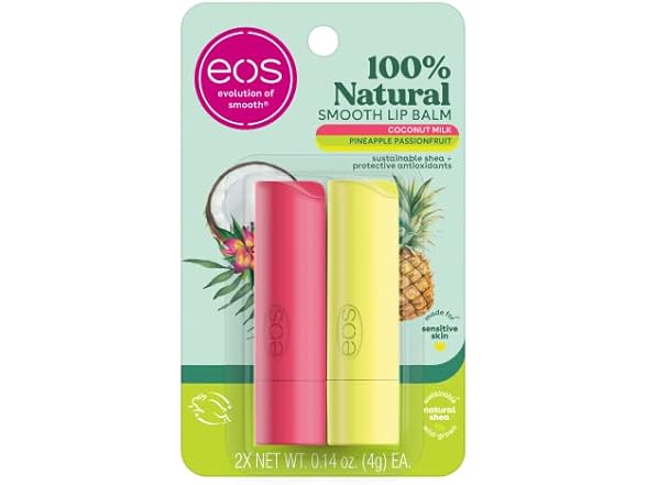Discover a lip balm that’s 100% natural and delicious. Our creamy and exotic Coconut Milk flavor tastes like tropical papaya and coconut to bring on those beach vacation vibes while our tart and tropical Pineapple Passionfruit flavor tastes like a fresh and fruity island colada. eos 100% Natural, dermatologist-recommended lip balm is formulated for sensitive skin and made with soothing shea butter, weightless coconut oil, and protective antioxidants. eos lip balms use sustainably sourced ingredients that provide all-day moisture and are sure to leave your lips feeling buttery smooth, hydrated, and with a delicious taste all day long.