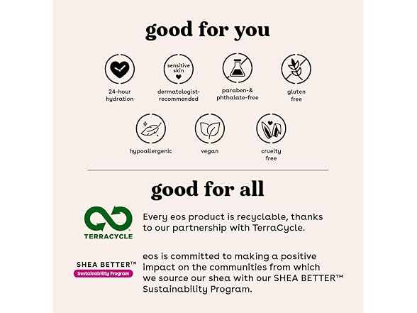 - ALL-NATURAL SHEA BUTTER: eos skin care products have wild grown, sustainably-sourced 100% natural shea butter, leaving skin moisturized. We are paraben, phthalate and gluten-free. Dermatologist tested. Vegan. Hypoallergenic. Leaping Bunny certified