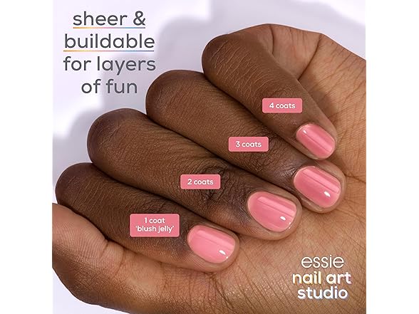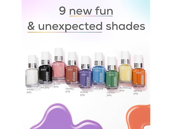 meet essie jelly gloss nail polish: a sheer, yet buildable translucent finish designed for layers of nail art fun. get the jelly nail look easily at home. sheer enough for a juicy glaze, opaque enough for luscious coverage. available in fun and unexpected shades from neutrals to brighter hues. endless possibilities: wear alone for a sheer wash of color, layer for a luscious milky-glaze or use multiple shades to design a custom look. featuring our exclusive easy glide brush for quick, streak-free, even and professional application at home.
