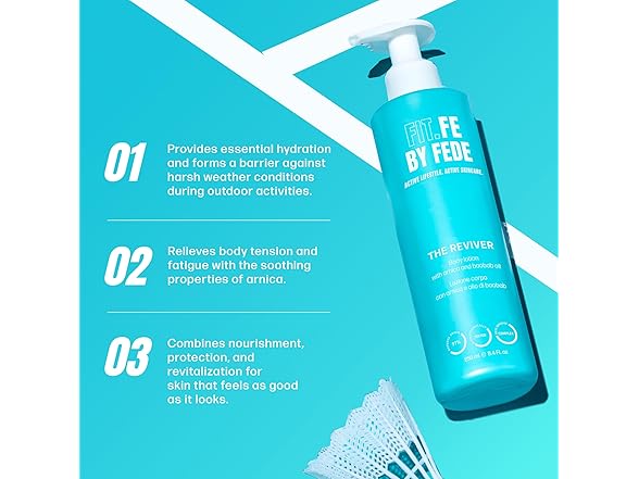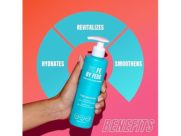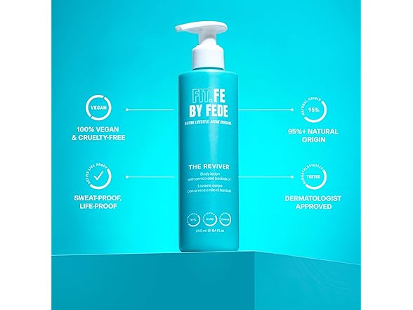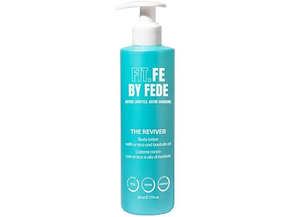 After a busy day of work and exercise, your skin deserves dedicated care that replenishes and restores. FIT.FE BY FEDE The Reviver Body Lotion is formulated as a fast-absorbing lotion to revitalize and deeply moisturize tired skin. This body lotion is enriched with arnica and baobab oil, which work together to soothe skin while delivering intense hydration. This body moisturizer is an exquisite blend of natural ingredients, with over 95 percent of its components derived from nature. The Arnica and Baobab Oil enriches the formula with deep moisturizing capabilities, making it an ideal body lotion for dry skin. Lightweight and non-greasy, it absorbs quickly, allowing you to indulge in the luxury of smooth, silky skin without any residue. This moisturizing body lotion leaves your skin feeling soft, nourished, and revitalized. Vegan and cruelty-free, this hydrating lotion ensures that you can care for your skin with a clear conscience. Enhance your skin care routine today with The Reviver Body Lotion by FIT.FE BY FEDE, where every application is a step towards complete wellness. Elevate your personal care products with this moisturizing cream, and discover the transformative power of a truly moisturizing lotion.