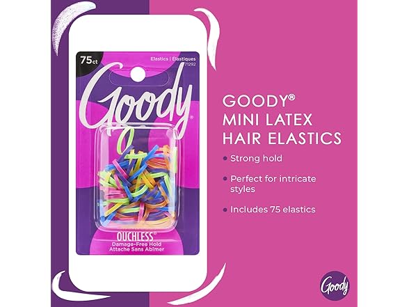 Goody Mini Latex Hair Elastics, 75 Count, Assorted Neon Colors, Suitable for All Hair Types, Pain-Free Styling Accessories for Women, Men, Boys & Girls, Long Lasting Braids, Ponytails & More