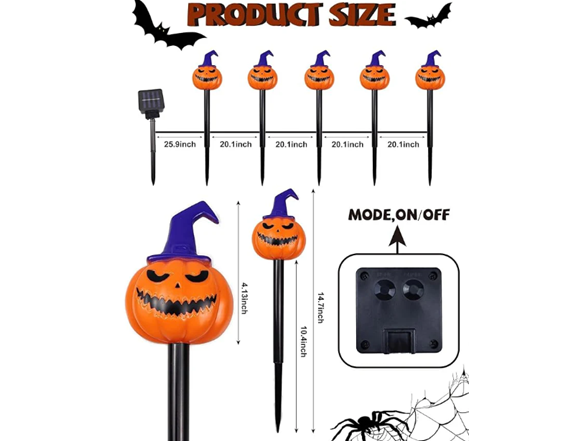 - Halloween Pumpkin Lights: 5 lighted pumpkin stakes, each of them is 35.5cm tall, and the total length of each 5 pumpkin lights is 8 feet, The Halloween decorations pathway lights Designed in the shape of a pumpkin Added the fun and appeal of Halloween.