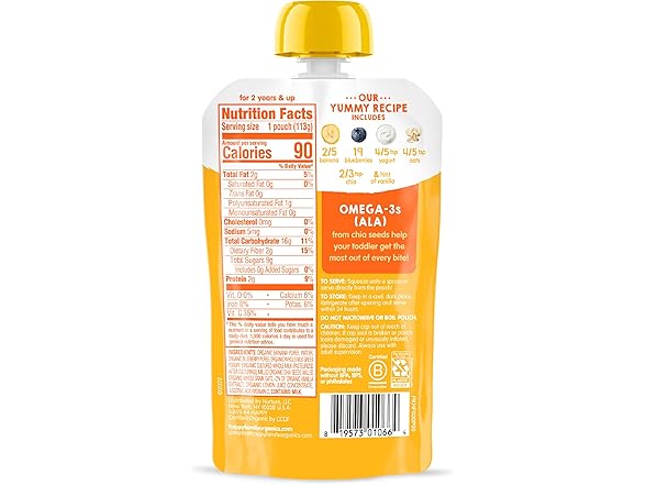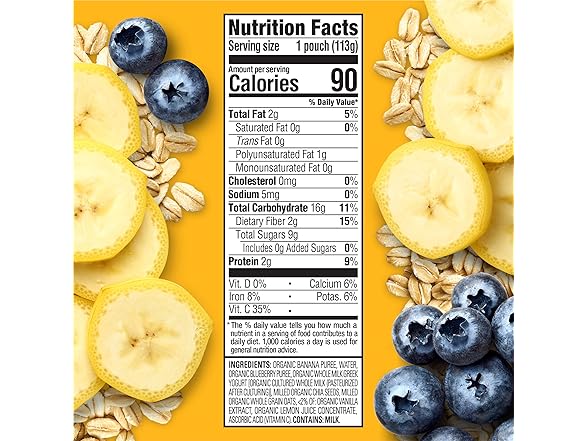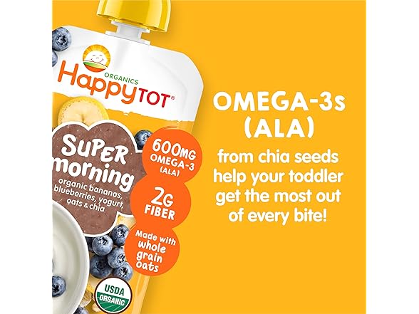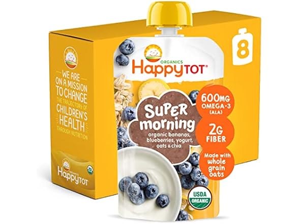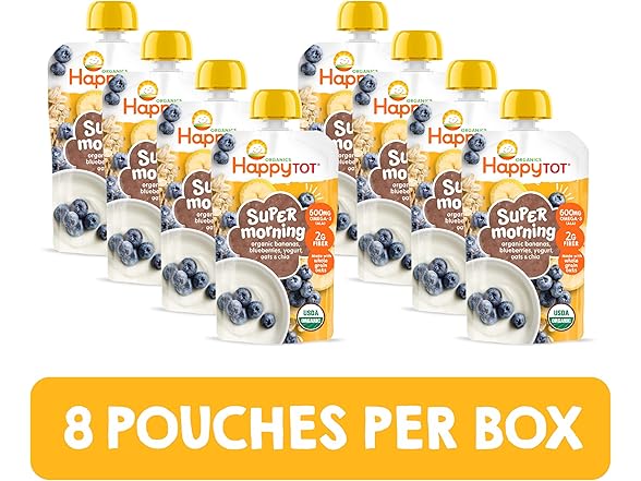 Happy Tot Organics Stage 4 Baby Food Pouches, Gluten Free, Super Morning Fruit & Oat Blend, Bananas, Blueberries, Yogurt, Oats & Chia, 4 Oz (Pack of 8)