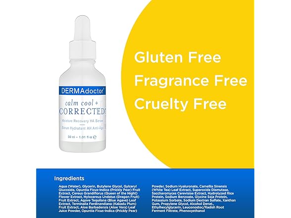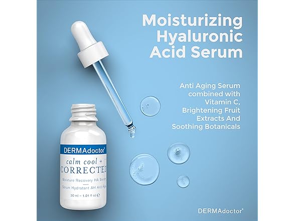 DERMAdoctor Solution: An oil-free serum moisturizer formulated with hyaluronic acid to hydrate and repair the most challenged, dry, eczema-prone skin. Hyaluronic Acid holds up to 1,000 times its weight in water, making it the go-to dermatologist-recommended moisturizing ingredient. This restorative serum soothes parched skin and assists deeper penetration of other skincare healing products. Skip to the end of the images gallery Skip to the beginning of the images gallery Ideal as a base layer for use with other Calm Cool + Corrected products to maximize results. Clean + Clinical + Cruelty Free Featured Ingredients Hyaluronic Acid - this mega-moisturizing humectant draws moisture from the air to keep skin feeling plump and looking dewy Vitamin C - helps protect against oxidative stress and support natural collagen production Queen of the Night Cactus – improves skin barrier function and humectant properties Blue Agave - brightens and clarifies Prickly Pear - contains 150% Vit E of Argan Oil + high content of water-binding compounds Dragon Fruit - rich in water to hydrate and Niacinamide to soothe redness and irritation Dermatologist Tested & Approved Allergy Tested, Hypoallergenic, Formulated to be Non-Irritating to the Skin, Formulated to be Non Drying, Non Comedogenic, pH Balanced, Oil Free, Synthetic Fragrance Free, Synthetic Dye Free, Cruelty Free, Gluten Free, Phthalate Free, No Animal Testing Skin Concern: Red, chapped, irritated, sensitive or eczema-prone skin. DERMAdoctor Solution: An oil-free serum moisturizer formulated with hyaluronic acid to hydrate and repair the most challenged, dry, eczema-prone skin. Hyaluronic Acid holds up to 1,000 times its weight in water, making it the go-to dermatologist-recommended moisturizing ingredient. This restorative serum soothes parched skin and assists deeper penetration of other skincare healing products. Skip to the end of the images gallery Skip to the beginning of the images gallery Ideal as a base layer for use with other Calm Cool + Corrected products to maximize results. Clean + Clinical + Cruelty Free Featured Ingredients Hyaluronic Acid - this mega-moisturizing humectant draws moisture from the air to keep skin feeling plump and looking dewy Vitamin C - helps protect against oxidative stress and support natural collagen production Queen of the Night Cactus – improves skin barrier function and humectant properties Blue Agave - brightens and clarifies Prickly Pear - contains 150% Vit E of Argan Oil + high content of water-binding compounds Dragon Fruit - rich in water to hydrate and Niacinamide to soothe redness and irritation Dermatologist Tested & Approved Allergy Tested, Hypoallergenic, Formulated to be Non-Irritating to the Skin, Formulated to be Non Drying, Non Comedogenic, pH Balanced, Oil Free, Synthetic Fragrance Free, Synthetic Dye Free, Cruelty Free, Gluten Free, Phthalate Free, No Animal Testing Formulated and Filled in the USA