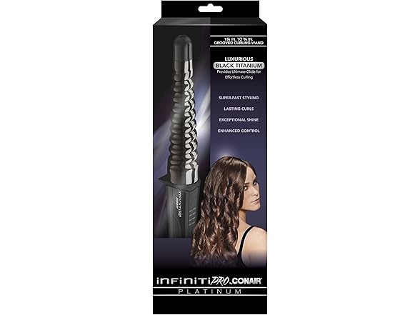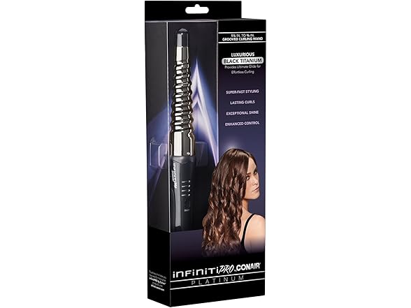 The Infiniti Pro by Conair Platinum 1 1/4-inch to 3/4-inch Grooved Curling Wand provides super - fast styling, lasting curls, exceptional shine, and enhanced control. Featuring luxurious black titanium this curling wand provides the ultimate glide for effortless curling for long, lasting curls. The black titanium barrel tames frizz for soft, silky curls. Enjoy super - fast styling with instant heat up that heats up to 356 degrees. Uniform heat recovery system maintains consistent, even heat during styling. The even heat eliminates hot spots for less damage and provides exceptional shine. This styler has enhanced control with 4 LED temperatures settings, auto off and dual voltage to create a custom styling experience. Bonus heat resistant glove for fast, effortless styling from roots to ends.