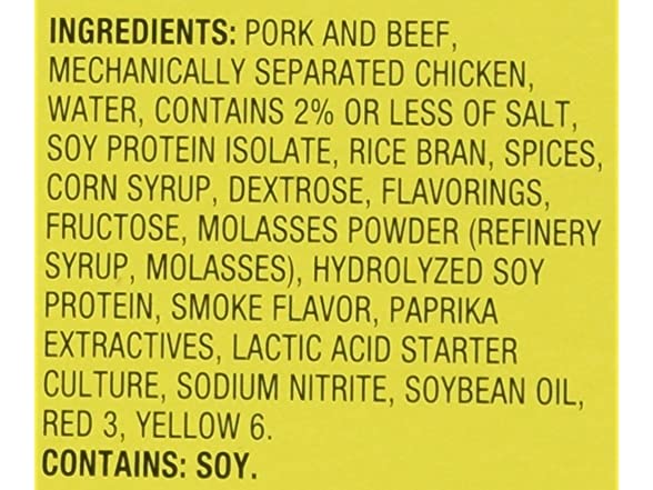 Ingredients: Pork And Beef, Mechanically Separated Chicken, Water, Contains 2% Or Less Of Salt, Soy Protein Isolate, Rice Bran, Spices, Corn Syrup, Dextrose, Flavorings, Fructose, Molasses Powder (Refinery Syrup, Molasses), Hydrolyzed Soy Protein, Smoke Flavor, Paprika Extractives, Lactic Acid Starter Culture, Sodium Nitrite, Soybean Oil, Red 3, Yellow 6