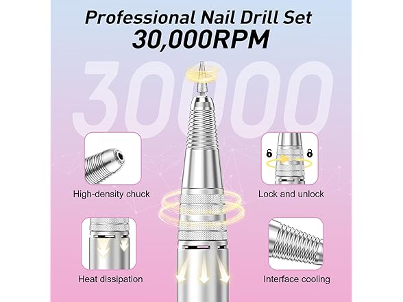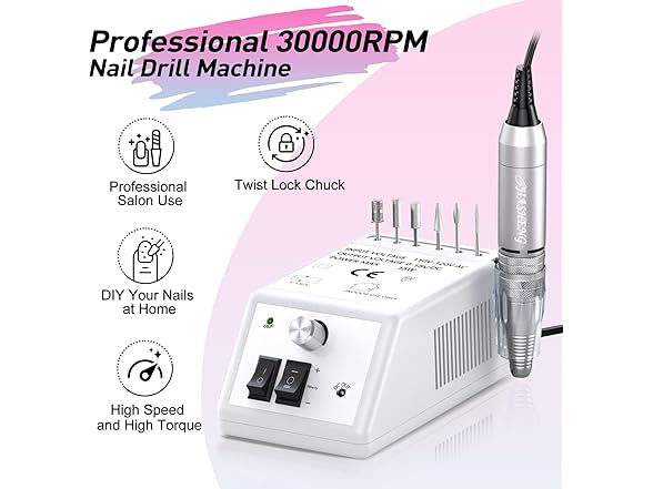 - Powerful Nail Drill Machine:0-30000rpm nail drill achieves professional hand and foot card for both natural and acrylic nails. Adjustable speed is user friendly, lower speed for nail polish, higher speed for acrylic nails, dipping powder nails and extension nails