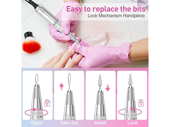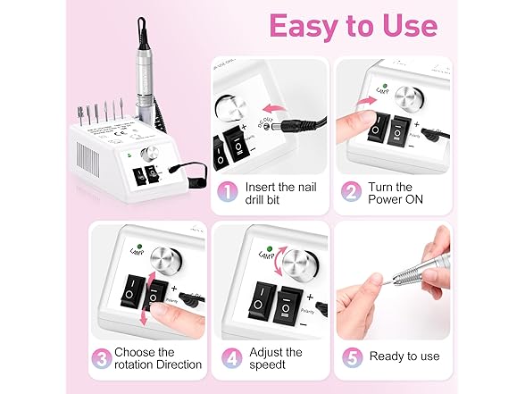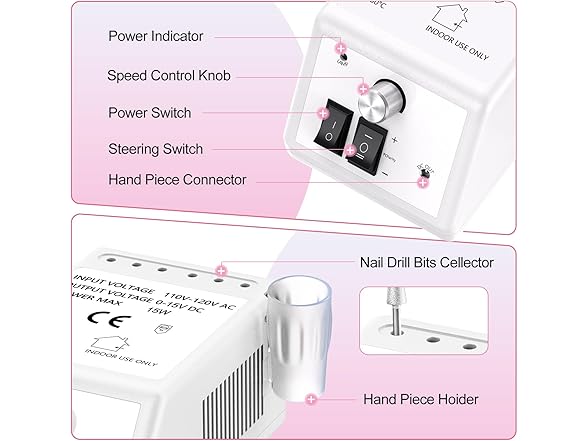 - Compact Electric Grinding File:Nail drills for acrylic nails are compact enough for your desk, our nail drill machine designed with 6 nail drill bits holder and hand piece holder, it is more convenient for your manicure and pedicure