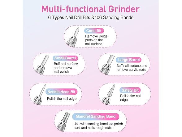 - Practical Acrylic Nail Kit: Electric nail file equipped with 6 nail drill bits and 100pcs sanding bands, meet all your demands for acrylic gel nails, dip powder nails and poly nail gels, works effective for polishing, shaping and removing