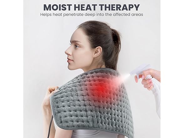 • Dry and Moist Heat Option: The neck heating pad is designed with dual functionality, a dry full body heating pad and a moist heating pad. Use the moist heat function by spraying the pad with water to dampen it before turning it on, which delves deeply into the muscles for a significantly more substantial soothing effect compared to dry heat. This feature penetrates deeper into muscles, providing more effective relief of muscle tension and soreness.
