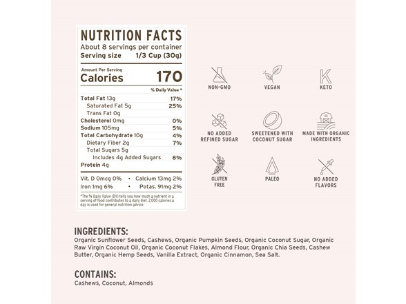 - Organic Sunflower Seeds, Cashews, Organic Pumpkin Seeds, Organic Coconut Sugar, Organic Raw Virgin Coconut Oil, Organic Coconut Flakes, Almond Flour, Organic Chia Seeds, Cashew Butter, Organic Hemp Seeds, Vanilla Extract, Organic Cinnamon, Sea Salt