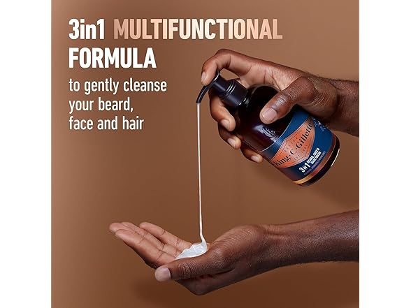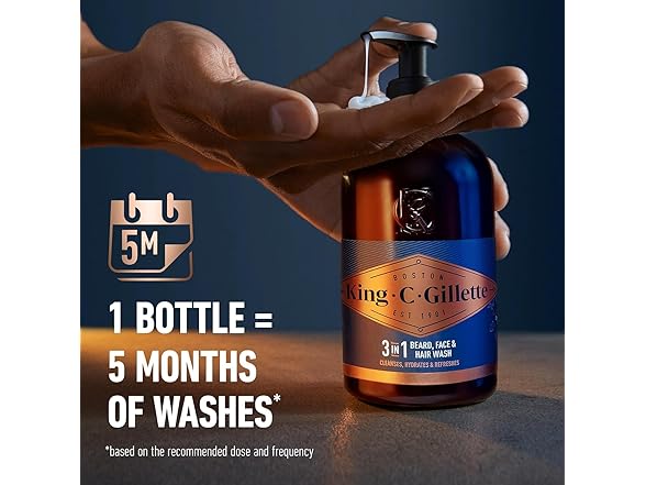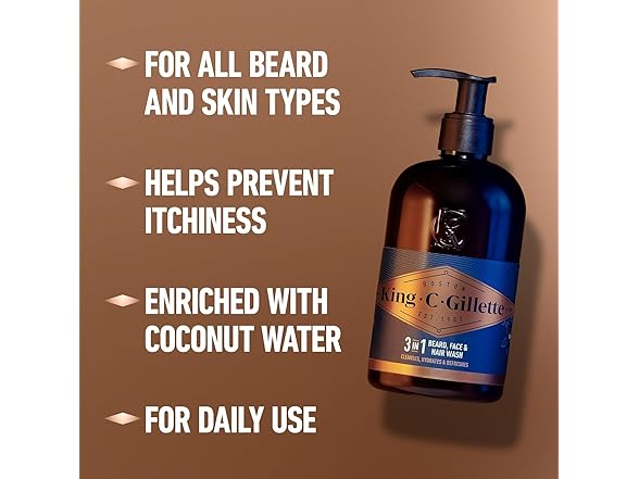 The pinnacle of over a century's worth of innovation and expertise, and the only range that bears the name of our company's founder: King C. Gillette. HAVING A BEARD IS MORE THAN JUST LETTING YOUR FACIAL HAIR GROW. Maintaining a well-groomed beard is a CRAFT that requires the right tools. Fueled by the spirit of our founder, the King C. Gillette line includes a complete set of precision tools and quality care products, to enable every man to create his own unique style. Our refreshing King C. Gillette beard and face wash for men is infused with coconut water, argan oil and avocado oil leaving your beard and skin feeling fresh and clean every day. Formulated mild cleansers and menthol giving a light cooling sensation that leaves the skin feeling refreshed and comfortable. Works into a rich lather and rinses away quickly and easily. Cleanses, refreshes and conditions your facial hair, and leaves your skin feeling fresh. Simply dispense a small amount in your hand, lather up, work into wet beard and rinse clean.