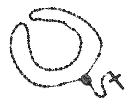 Ladies Black IP Rosary Necklace with Cross Pendant