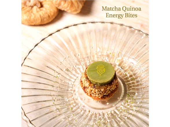 Matcha Quinoa Energy Bites: Roasted quinoa with pistachio blends well with fig. Touch of Japanese Matcha green tea compliments the recipe.