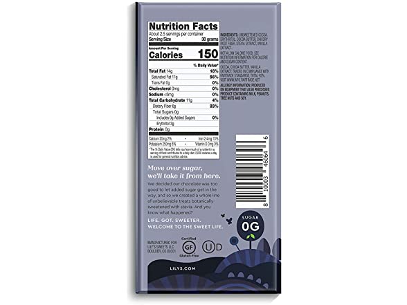 - Sweetened with Stevia - Stevia is a zero calorie botanical sweetener. It is derived from the plant Stevia Rebaudiana. Stevia has sweetened foods and beverages for centuries. Our use of Stevia gives Lily's natural a richness and less sugar than typical chocolates.