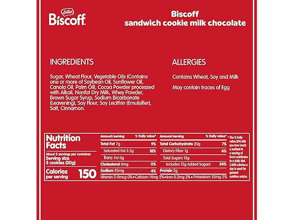 In the Box: (1) Lotus Biscoff Sandwich Cookies, Milk Chocolate Cream, 22 Cookies per pack, 7.76 Ounce