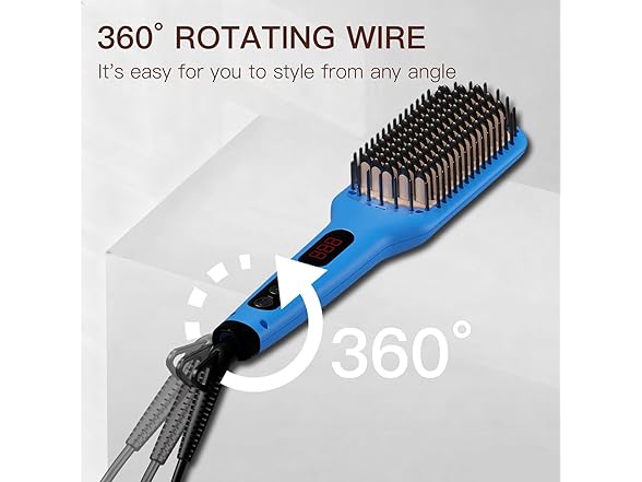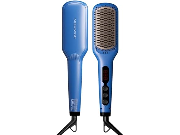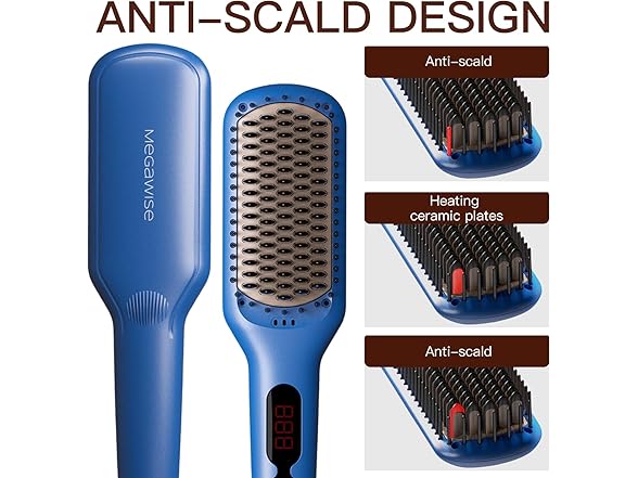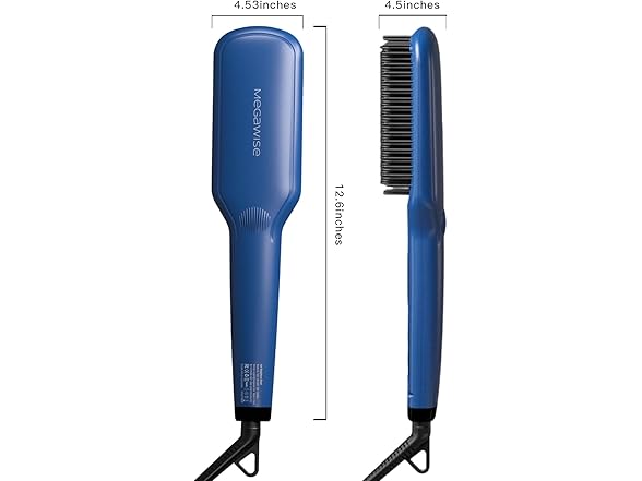 (1) MEGAWISE Pro Ceramic Ionic Hair Straightener Brush for Home Salon, Straightening Hair Brush with 20s Heating Tech, Auto-Off, Anti-Scald with Universal Dual Voltage,Rotatable Power Cord, Gentian Blue