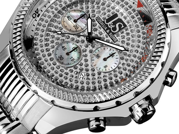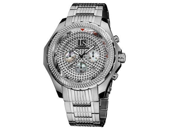 This handsome timepiece from Joshua & Sons showcases stainless steel construction with a pave pattern dial. The men's watch offers three mother of pearl subdials and a date display at 4 o'clock.