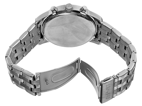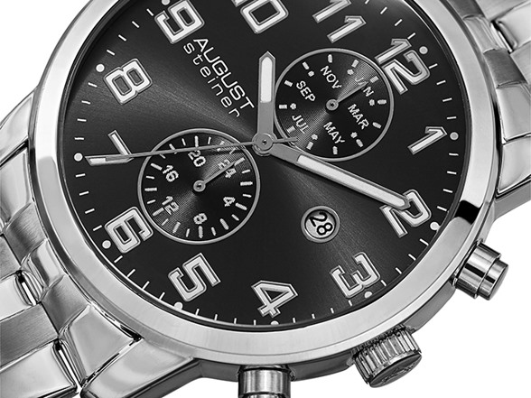 This August Steiner men’s watch has a multifunction dial displaying the month and dual time-zone. It features easy to read markers and a chic dial design. The sturdy stainless steel bracelet and precise Swiss quartz movement make this watch a keeper.