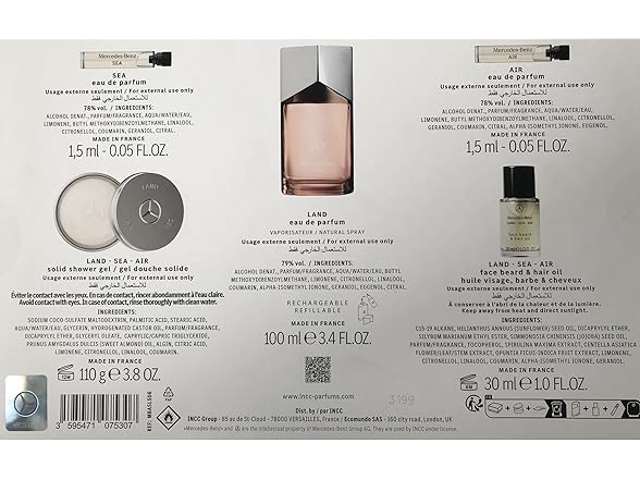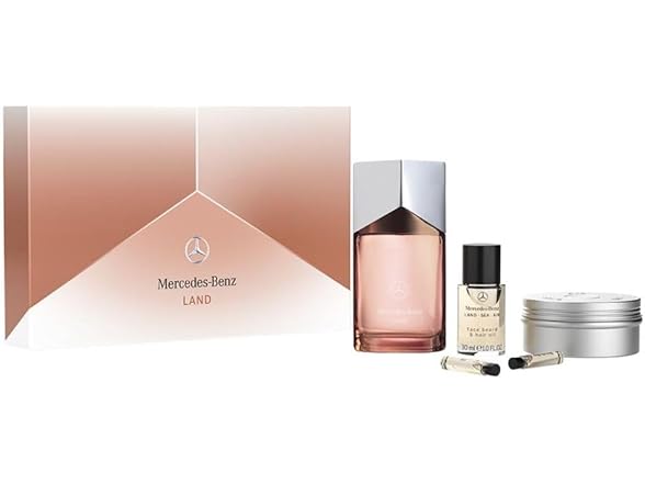 - Men's Cologne Gift Set: The Mercedes-Benz Land LSA Giftset includes a 3.4 oz Land EDP mens cologne spray, 1 oz hair and beard oil, 0.05 oz Sea EDP, 0.05 oz Air EDP, and a solid shower gel for a complete personal care experience.