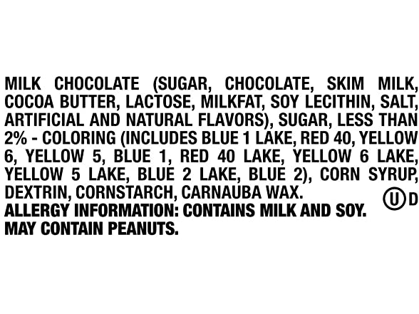 Ingredients: Milk Chocolate (Sugar, Chocolate, Skim Milk, Cocoa Butter, Lactose, Milkfat, Soy Lecithin, Salt, Artificial and Natural Flavors), Sugar, Less than 2% - Coloring (Includes Blue 1 Lake, Red 40, Yellow 6, Yellow 5, Blue 1, Red 40 Lake, Yellow 6 Lake, Yellow 5 Lake, Blue 2 Lake, Blue 2), Corn Syrup, Dextrin, Cornstarch, Carnauba Wax.