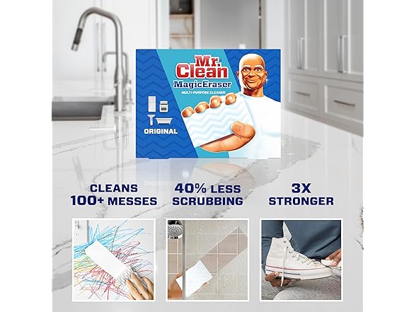 Mr. Clean Magic Eraser Original scrubber is 2X Stronger* with DURAFOAM. Micro-scrubbers reach into the surface grooves, lifting away built up dirt and grime with water alone! Use it all around the house as a multi surface cleaner, wall cleaner, bathtub cleaner, oven door cleaner, or for erasing marks on light switches, doors and more! *Cleaning performance vs. the leading all-purpose bleach spray