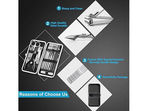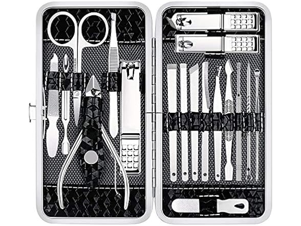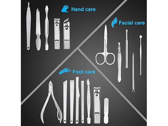 - Multiple tool options:Professional Manicure Kit contains 18 tools for hand care, facial care and foot care which can meet all of you needs.No need to pay for a single nail clippers or Nose Hair Scissors,money can be saved.Even thick nails can be easily cut off directly,No need to use a lot of force.