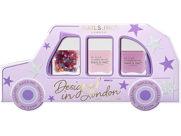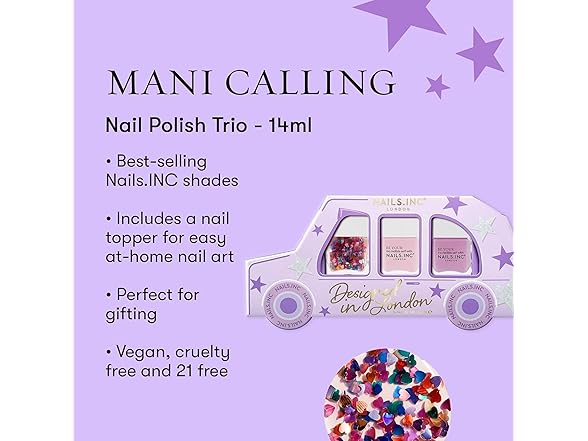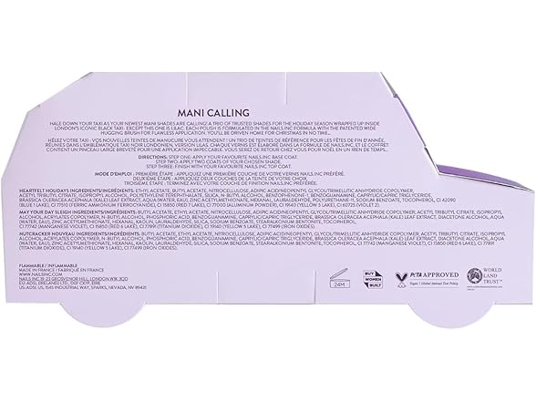 Hale down your taxi as your newest mani shades are calling! A trio of trusted shades for the holiday season wrapped up inside London’s iconic black taxi- except this one is lilac. Each polish is formulated in the nails.inc formula with the patented wide hugging brush for flawless application. You’ll be driven home for Christmas in no time… HEARTFELT HOLIDAYS is a rainbow heart nail polish topper MAY YOUR DAY SLEIGH is a peach pink shade NUTCRACKER NOUVEAU is a fondant pink shade