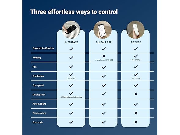 - THREE WAYS TO CONTROL: Personalize your setting either through the device interface, via a remote control or through the Blueair App*. Connect to the app for more advanced personalization like Alexa/Google Home voice control, setting a schedule, controlling brightness or set up ECO mode.