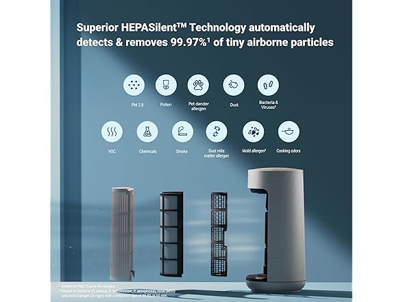 - QUALTIY FILTRATION: Our HEPASilent dual filtration technology combines traditional mechanical filtration with electrostatic charge to remove 99.97%**** of airborne particles down to 0.1 microns, ensuring smoke, dust, allergen matter and even tiny particles, such as viruses and bacteria*****, are captured with minimal noise *Tested on PM2.5 up to 90 minutes **Tested on bacteria (S. aureus, K. pneumoniae, P. aeruginosa), virus (MS2) and mold allergen (A.niger) with a minimum reduction rate of 99.8% in 60 min.
