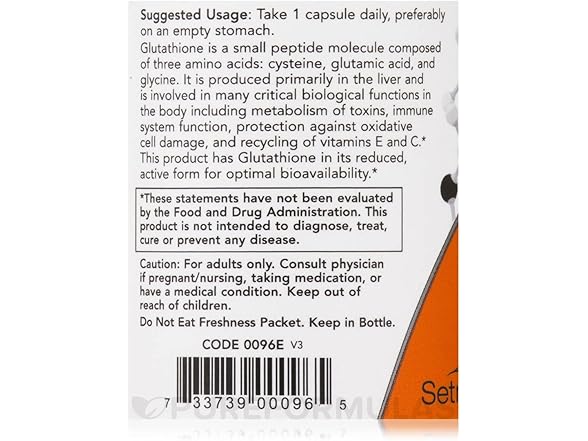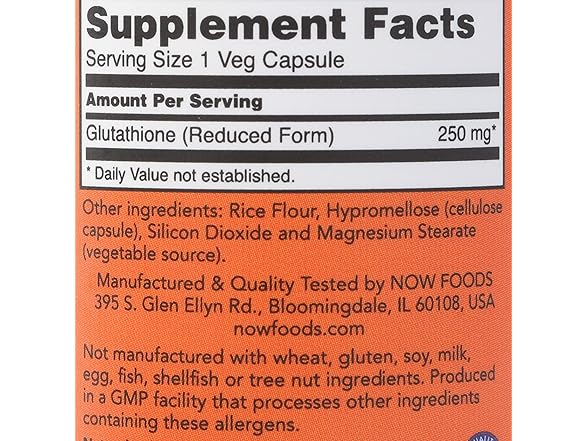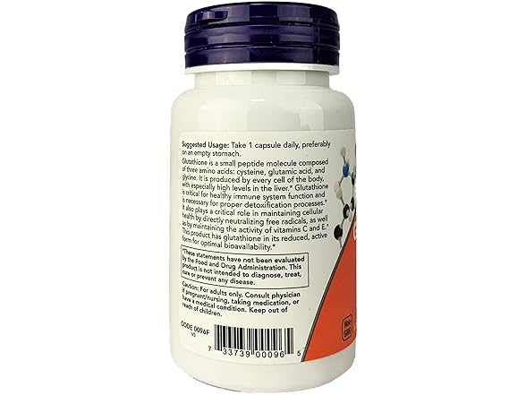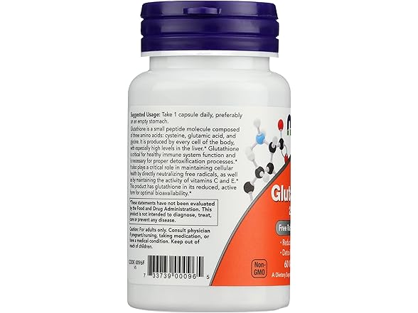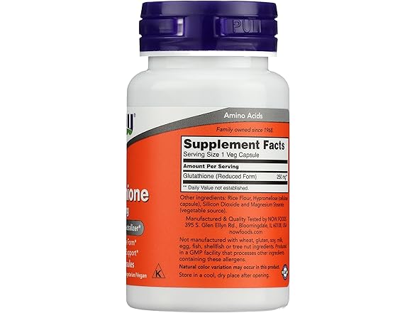 Put brakes on free radical activity in your body at the cellular level with Glutathione Capsules from NOW Foods. Glutathione is a tripeptide amino acid that our liver makes from cysteine. Being a super antioxidant glutathione helps fight free radicals in your body. Glutathione has the ability to regenerate natural antioxidant vitamins C and E. Glutathione appears to be involved in several processes in the body such as tissue building and repair thus aiding production of essential chemicals and protein in the body. This substance also helps augment the immune system and protects the body from contracting infections. Glutathione in this supplement from NOW Foods is natures antidote to oxidative stress and it may promote a healthy immune response aid in DNA repair and detoxify your body. It helps alleviate chronic fatigue autoimmune conditions environmental allergies and liver conditions too. Boost the health of good cells in your body to support overall health with Glutathione Capsules from NOW Foods. These statements have not been evaluated by the Food and Drug Administration (FDA). These products are not meant to diagnose treat or cure any disease or medical condition. Please consult your doctor before starting any exercise or nutritional supplement progRAM or before using these or any product during pregnancy or if you have a serious medical condition. CALIFORNIA PROPOSITION 65 WARNING: This product contains a chemical known to the state of California to cause cancer, birth defects or other reproductive harm.