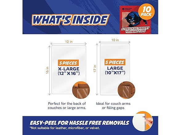 🐱 KEEP SCRATCHES AT BAY WITH OUR 10-PACK 🛡️ Experience the ultimate protection against cat scratches with our 8-pack Cat Scratch Deterrent & Training Tape! With 5 XL (16x12 inches) and 5 L (17x10 inches) sheets, safeguard your furniture from every angle. Embrace the convenience of wider coverage without messy cutting. Our tape's double-sided adhesive ensures a secure fit while being gentle on surfaces. Train your cat effortlessly and bid farewell to costly repairs.